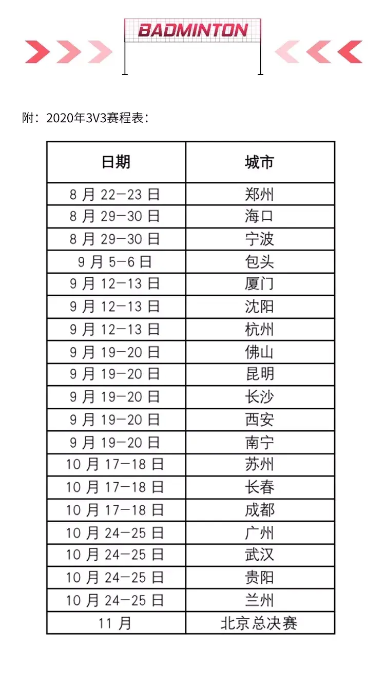 附:2020道达尔李宁李永波杯3v3羽毛球赛时间表: