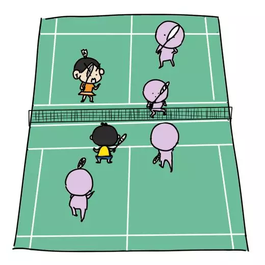 如果第一拍发网前,对方想打后场,球必然是往上挑,不能推得太平,因为前场有两人拦截,所以对方会把球挑得高高的,这时,后场运动员也有足够的时间准备移动进攻。