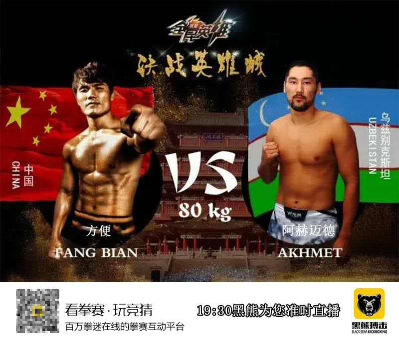 压轴大战中,对阵双方为中国拳手“死神”方便和他的对手乌兹别克斯坦选手艾哈迈托夫。
