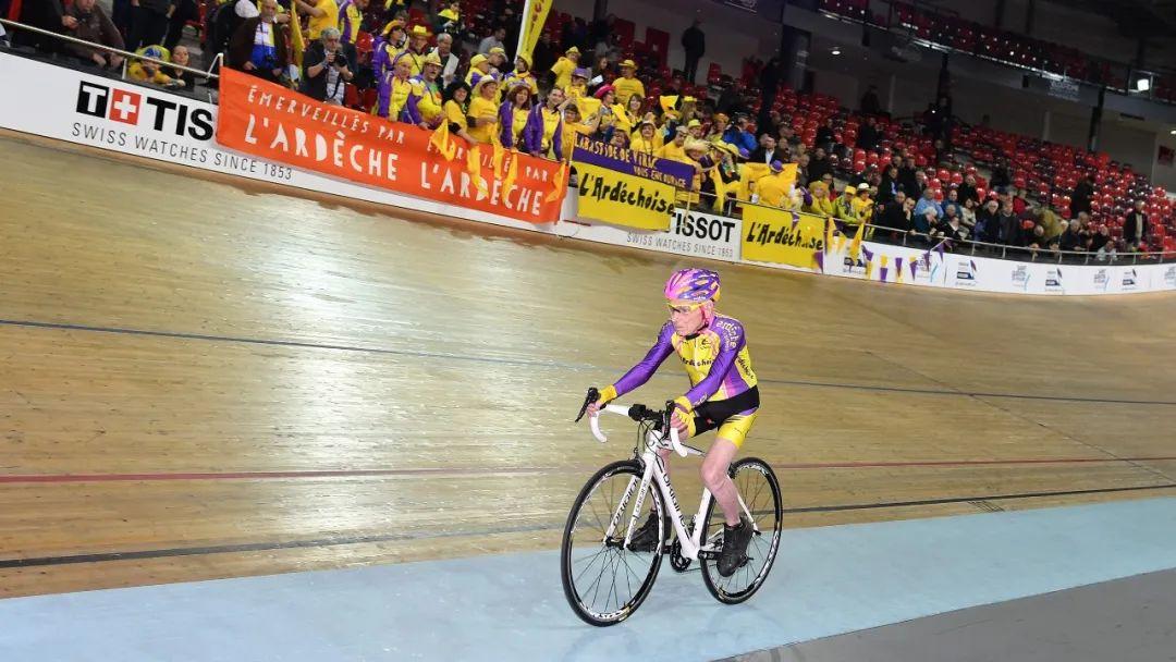 上图:伊夫林省圣康坦自行车馆场馆采用了模块化、可移动设计,因此拥有一个超大面积的中央区域。图为当地时间2022年1月3日,法国巴黎,在伊夫林省圣康坦自行车馆,民众在场地中央等待接种新冠疫苗,与此同时,场地自行车运动员正在场地外环进行训练。下图:当地时间2017年1月4日,法国,105岁的Robert Marchand骑行1小时,打破了自己的骑行纪录。
