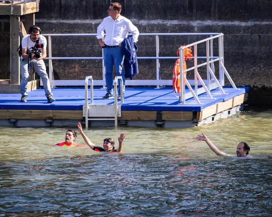 备受关注的巴黎市长终于还是下水了。在当地时间2024年7月17日10时许,也就是本届奥运会开幕前9天,巴黎市长安妮·伊达尔戈身穿特制的连体潜水服,头戴黑色泳镜,带领奥组委主席托尼·埃斯坦盖和巴黎地区省长马克·吉约姆,小心翼翼地沿码头梯子下到塞纳河中,秀了一段自由泳,以此佐证7月12日由法国政府宣布的显示塞纳河水“干净又卫生”的水质分析结果,并为即将在塞纳河中参加马拉松游泳、铁人三项、残奥铁人三项比赛的选手打个样儿。但巴黎奥组委也仍明确表示,一旦奥运会期间出现暴雨天气,铁人三项将不再进行游泳项目的比赛。