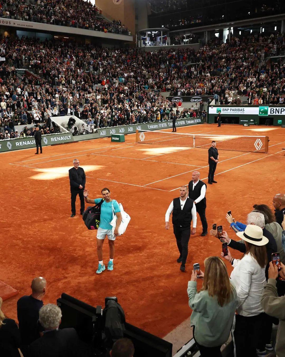 当地时间2024年5月27日,法国巴黎,罗兰·加洛斯体育场,2024法网男单,西班牙选手纳达尔结束比赛离开球场。