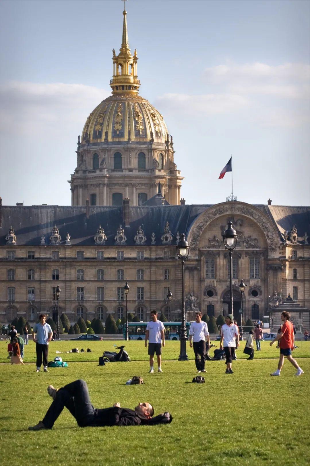 荣军院广场同样是巴黎市中心的一个标志性景点。平日里,当地人们习惯在荣军院两侧的大片草坪上散步、平躺休息、晒太阳、踢球、玩橄榄球,尽情享受闲暇时光。而在本届奥运会期间,这里搭建了临时的比赛设施,用于举办奥运会和残奥会射箭比赛,并作为马拉松比赛的终点和公路自行车比赛的其中一个途径地。