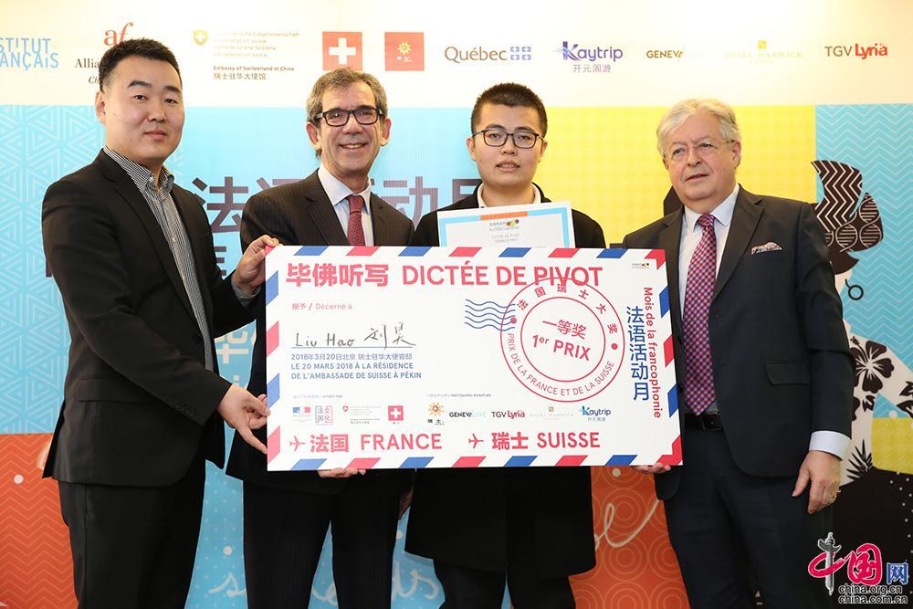 法国驻华大使黎想(左二)与瑞士驻华大使戴尚贤(右一)为第一名(右二)颁奖。 图片由使馆提供