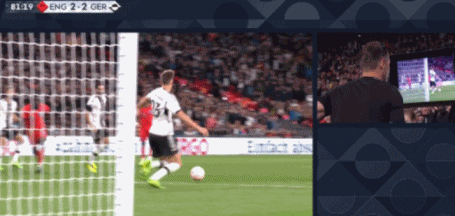 下半场易边再战,第49分钟,斯特林在禁区前偏左位置右脚抽射远角,特尔施特根侧身将球抱住。第50分钟,马奎尔后场传球被穆西亚拉断下,后者带球进入禁区,马奎尔慌乱之下踢倒了穆西亚拉。裁判到场边观看VAR后给了德国队一个点球。