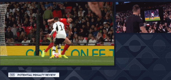 第81分钟,詹姆斯在前场直塞,禁区内的凯恩倚住后卫转身抽射,皮球打在了边网上。第82分钟,施洛特贝克在禁区内放铲,踩到了贝林厄姆脚踝上,裁判观看VAR后给了英格兰队一个点球。