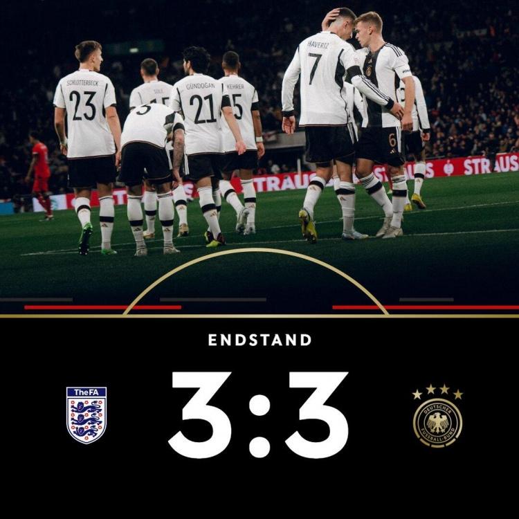 北京时间9月27日凌晨2点45分,2022-23赛季欧洲国家联赛A级第6轮迎来一场强强对话,英格兰队坐镇主场温布利迎战德国队。上半场,两队都没有进球;下半场风云突变,马奎尔送点,京多安罚进,哈弗茨世界波扩大比分,随后英格兰队由卢克·肖和芒特进球扳平比分,凯恩的点球破门帮助英格兰队反超了比分,哈弗茨梅开二度完成绝平。最终,英格兰队在主场3-3战平德国队,6轮小组赛取得3平3负未尝一胜,降级到欧国联B级。