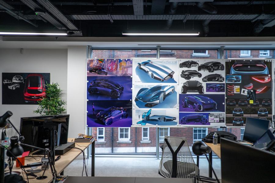 在市中心的马里波恩大街,上汽伦敦设计中心就坐落于此。走进位于2楼的设计中心,墙上贴满炫酷的汽车设计图,展示着各个部位的细节设计。设计师的工作台上,摆放着一些汽车模型。设计师在这里施展才华、挥洒创意。