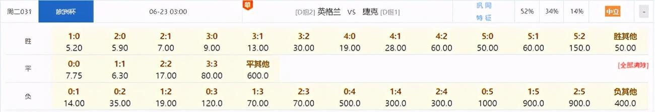 目前竞彩官方开出了英格兰VS捷克 1.43(胜)-3.28(平)-7.40(负)的组合,英格兰对于3分势在必得。从支持率来看,英格兰赢球支持率为52%,平局支持率为34%,捷克支持率为14%。另外从竞彩开出的比分来看,英格兰1-0小胜的赔率是5.20,2-0取胜的赔率为5.90,结合英格兰之前的表现来看,此役面对捷克,英格兰或是一球小胜的局面。