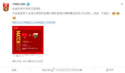 中国足球队官方宣布,国足12强赛第5轮与阿曼的比赛将于北京时间11月11日23:00在阿联酋沙迦体育场进行,加油!