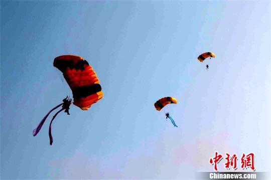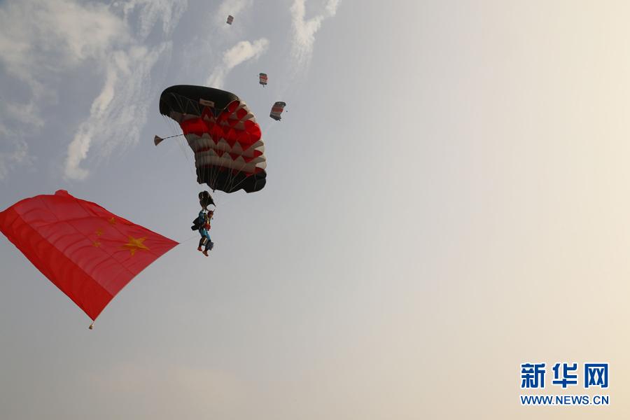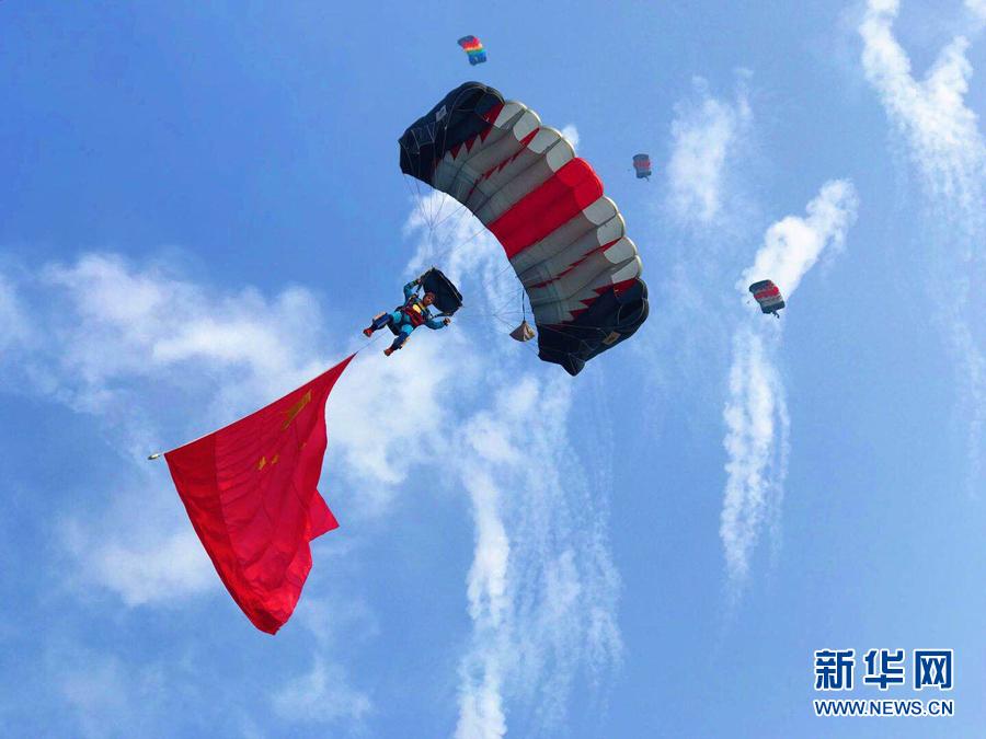 图为:2017年全国跳伞锦标赛开幕式上的跳伞表演