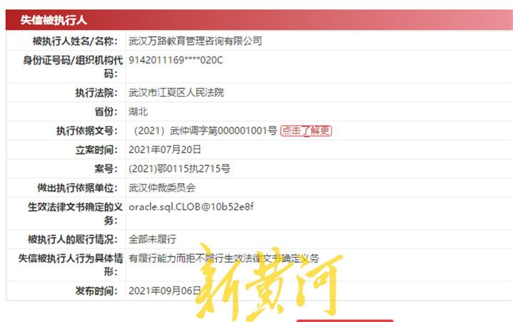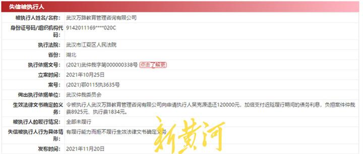 记者查询天眼查了解到,武汉万路教育管理咨询有限公司成立于2009年8月28日,注册地位于武汉市江夏区大桥新区办事处大桥村联投广场商业区,法定代表人为申某,主营业务为教育咨询(不含教育培训)。2021年5月20日,该公司被武汉市江夏区市场监督管理局列入经营异常名录。