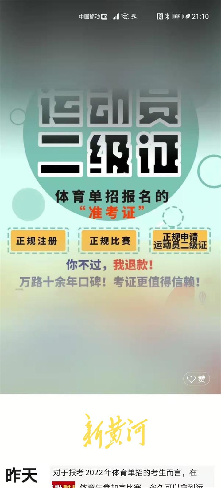 新黄河记者在万路教育微信公众号上发现,该培训机构持续发布着关于体育单招、运动员证书的相关信息,并在信息后附有万路教育官方客服以及老师的联系方式。