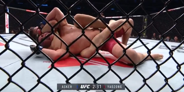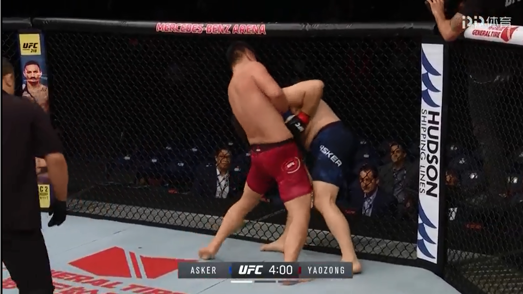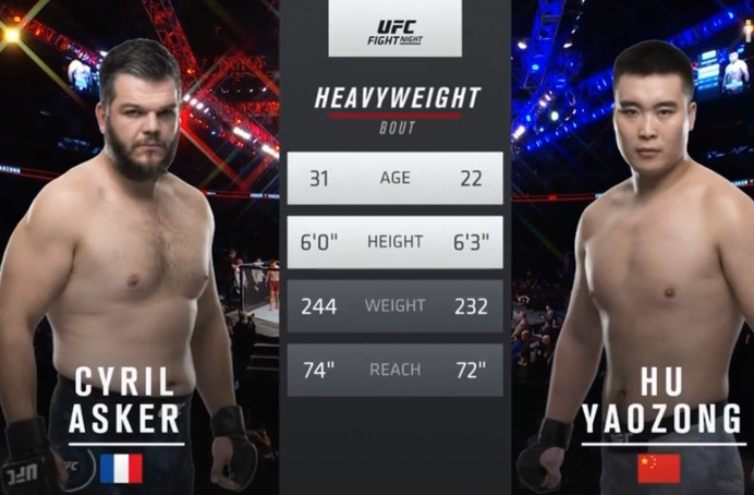 UFC上海站 用武之地讯。UFC格斗之夜上海站的比赛,副赛第一场比赛是一场重量级(120KG)的比赛,胡耀宗(蓝方)临危受命成为中国首位杀入UFC的大级别MMA拳手,他顶替詹姆斯-穆赫伦对阵来自法国的“银背猩猩”阿斯克(红方)。从对阵表可以看到胡耀宗的体重并不占优,但是开场不久胡耀宗就使出了断头台,可惜未能降服对手,而重量上的劣势也让胡耀宗在和阿斯克的地面缠斗中处于被动,在第二回合,阿斯克继续保持侵略性,并在比赛过半时裸绞获胜,胡耀宗遗憾落败。
