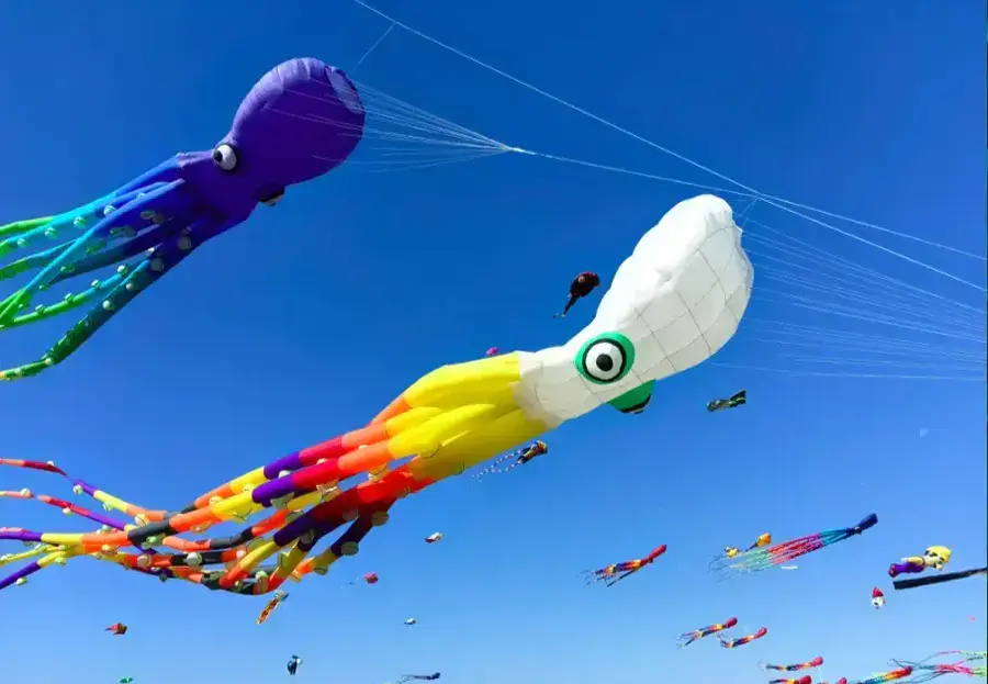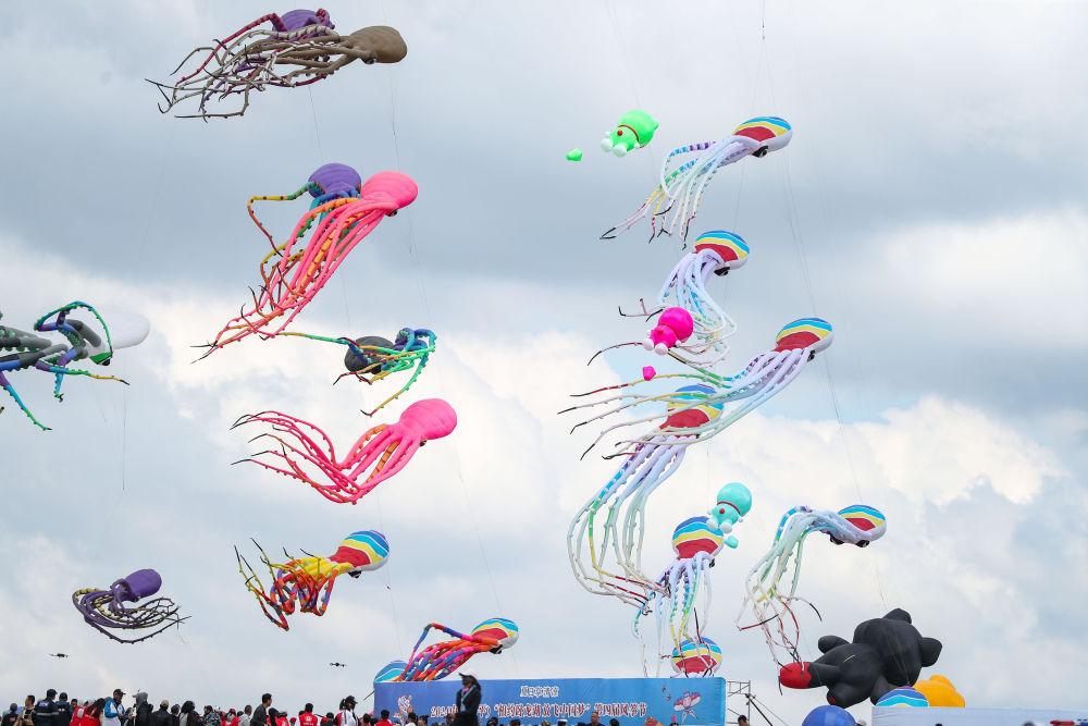 除了竞技项目,现场同步进行着大型软体风筝表演,蜈蚣、鱿鱼等各式各样造型的软体风筝竞相飞上天空,上演“天空动物园”,场面蔚为壮观,吸引了大量参观者拍照“打卡”。