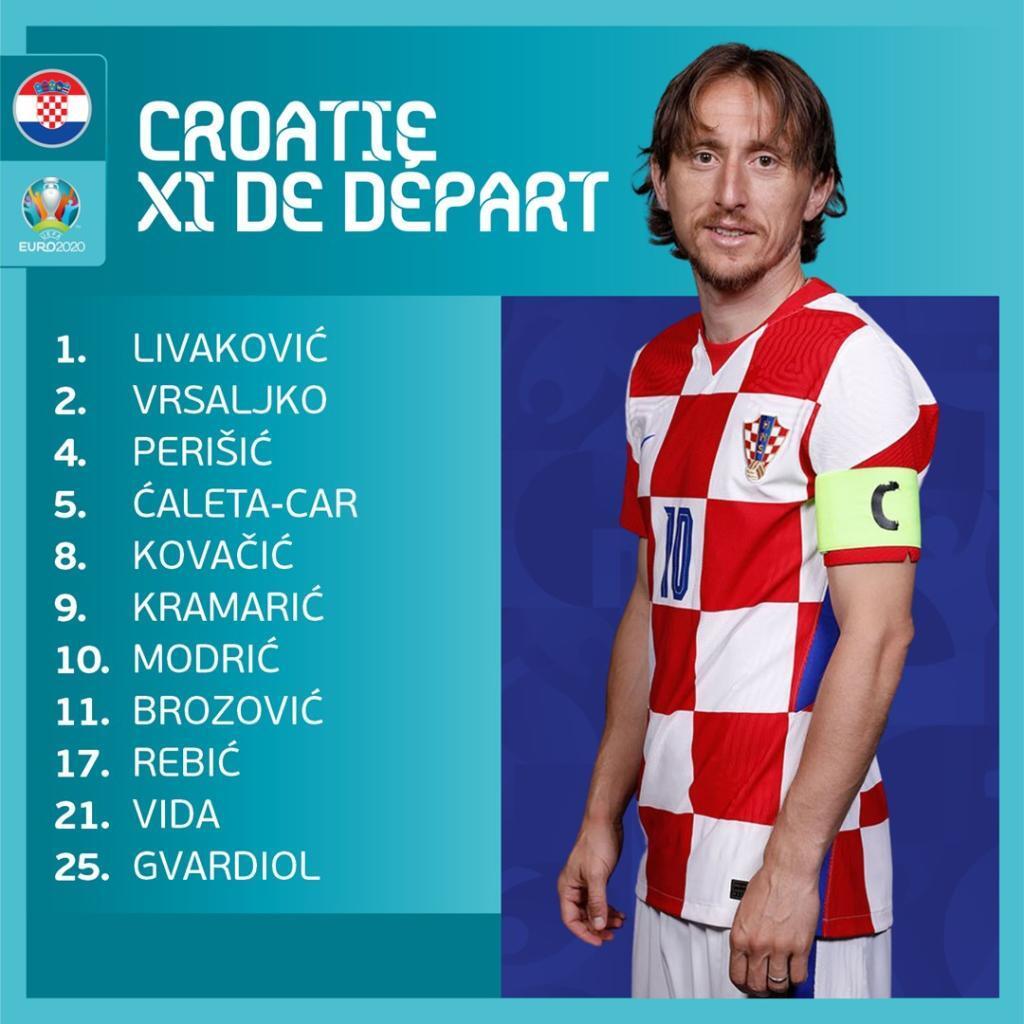 克罗地亚队首发:23-苏巴西奇;2-弗尔萨利科、21-维达、6-洛夫伦、3-斯特里尼奇;7-拉基蒂奇、10-莫德里奇、18-雷比奇、4-佩里西奇、11-布罗佐维奇;17-曼朱基奇
