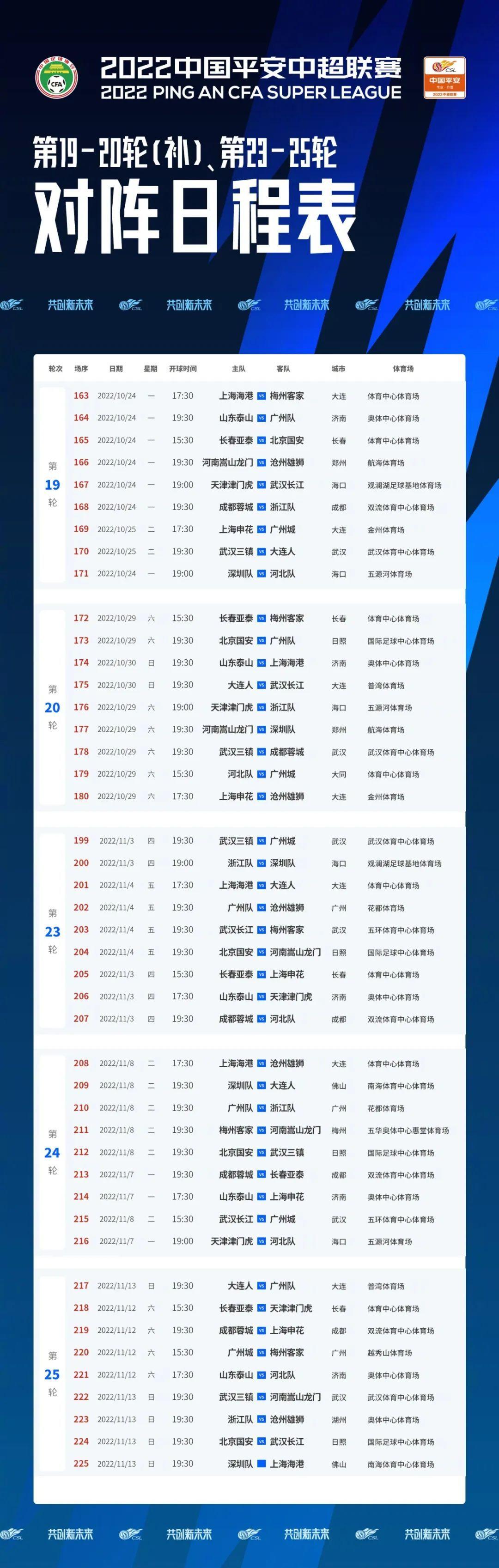 10月14日,中超联赛发布第19、20轮补赛以及第23至25轮赛程表,联赛将于10月24日继续进行。