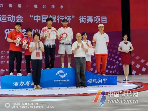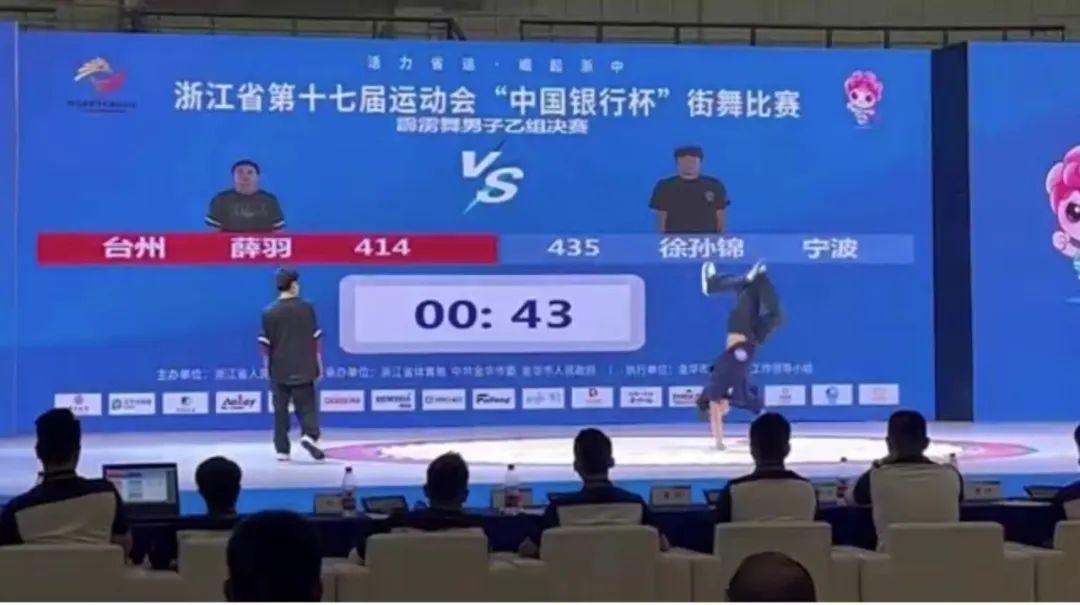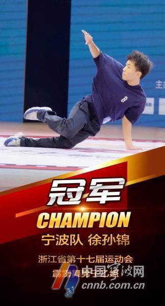 28日,在金华进行的浙江省第十七届运动会街舞(霹雳舞)项目进行了最后一个项目男子乙组的冠军争夺,宁波运动员徐孙锦以3:0战胜台州队的薛羽,为宁波代表团拿下竞技体育项目的首金。