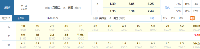 目前,竞彩官方为本场比赛开出1.39(胜)3.85(平)6.25(负)的赔率数据。比分方面,英格兰1-0、2-0取胜的赔率均为6,2-1、3-0、3-1分别为6.9、9、11,双方1-1战平的赔率为7.75,这也是双方上次世界杯交手时的比分。