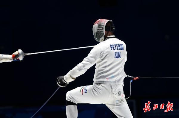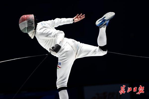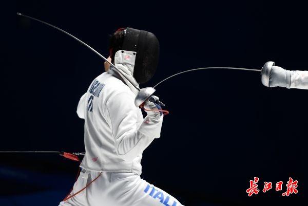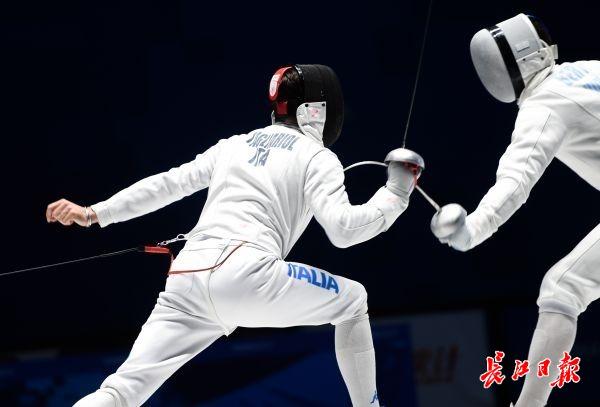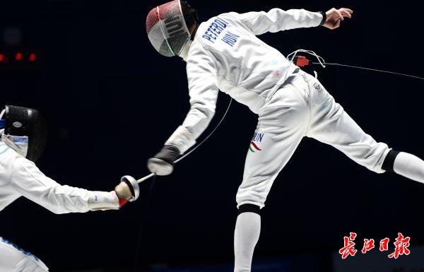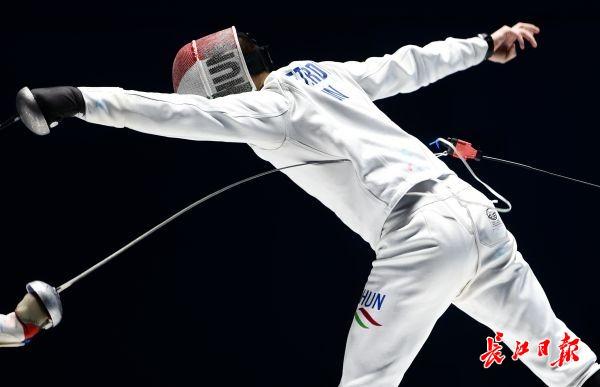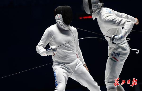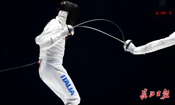 长江日报-长江网10月23日讯 击剑是双人比赛,比赛中,一方用剑尖刺击对手,使剑尖准确无误地刺在有效部位并具有刺入的性质。最后有效点击数多的一方为胜。按规则,循环赛在四分钟内五次击中,淘汰赛在九分钟内十五次击中。最先击中对方达有效次数,或时间到后击中对方次数多者为胜。团体赛,最先击中对方达45次的团队为胜。 击剑运动有三种武器:重剑、花剑、佩剑。三种武器的有效击中点及比赛规则亦有不同,故每种武器都有其竞技特点。来看意大利与匈牙利争夺男子重剑团体比赛冠军精彩刺剑瞬间。(记者许魏巍 摄)