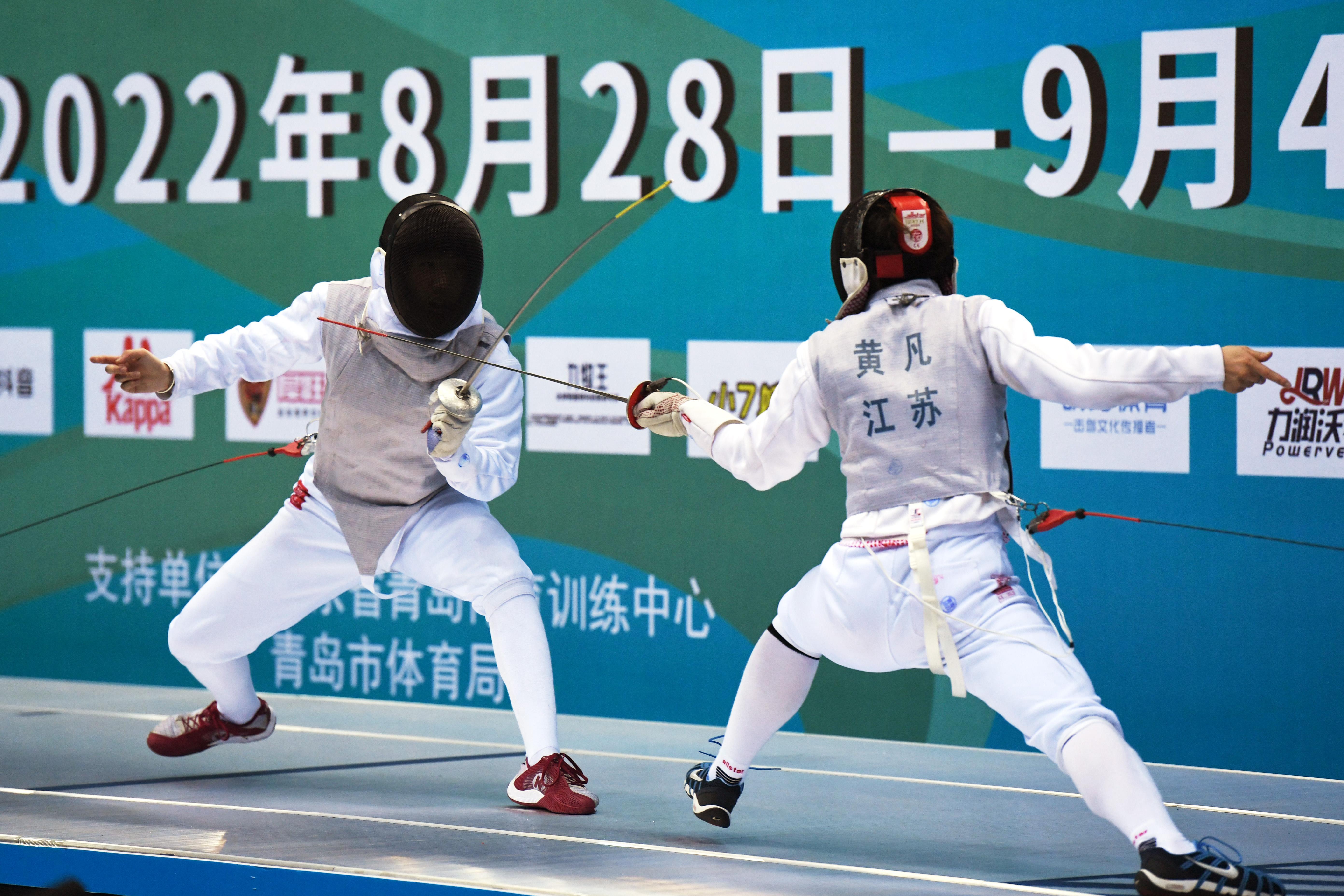 8月28日,浙江队选手柯智萱(左)与江苏队选手黄凡在青年组女子花剑个人决赛中。柯智萱以15比12战胜黄凡,夺得冠军。 新华社记者 李紫恒 摄