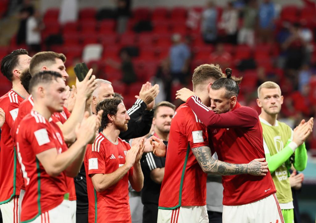 11月29日,威尔士队球员加雷斯·贝尔(右二)在比赛后与队友拥抱。新华社记者 兰红光 摄