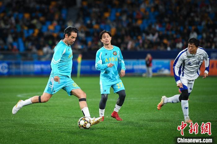 10月18日,香港明星足球队球员徐荣(左一)在比赛中控球。记者 佟郁 摄