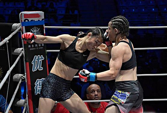 勇士荣耀联盟顺远功夫王俱乐部的“金刚芭比”黄飞儿首遇强敌,巴西女将“微笑杀手”阿丽亚娜.卡涅洛丝不仅深通巴西柔术,泰拳格斗技也实力非凡,保持着四战全胜的职业战绩。第一回合双方僵持不下,阿丽亚娜在第二回合积极主动打破僵局,以左右摆拳连续重击黄飞儿,瞬间改写擂台局势,以TKO获胜!