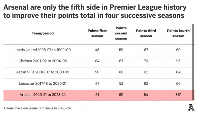 阿森纳是英超历史上连续四个赛季提分最多的球队