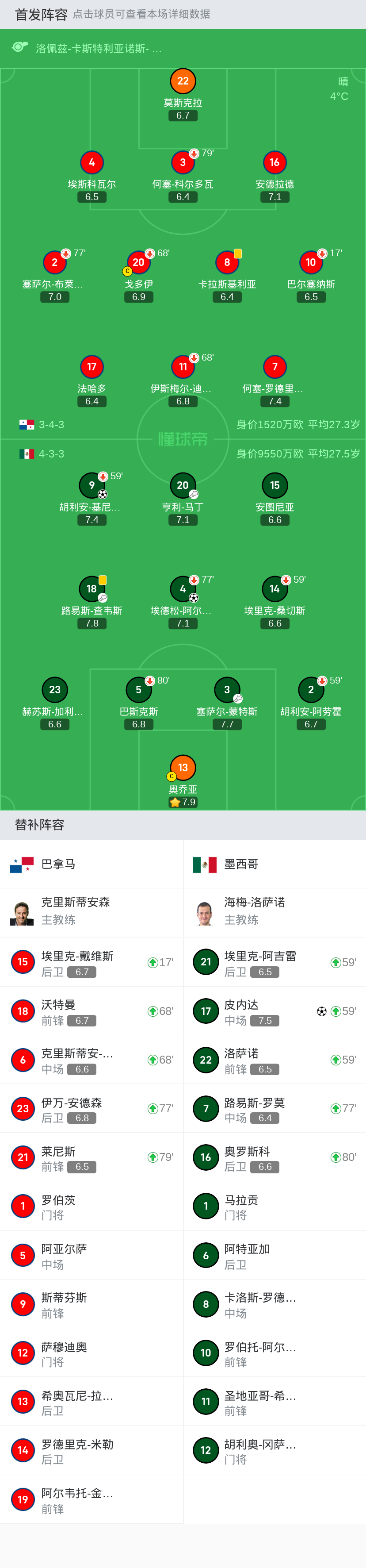 墨西哥 首发:13-奥乔亚, 20-亨利-马丁, 18-路易斯-查韦斯, 23-赫苏斯-加利亚多, 3-塞萨尔-蒙特斯, 9-胡利安-基尼奥内斯, 14-埃里克-桑切斯, 4-埃德松-阿尔瓦雷斯, 15-安图尼亚, 5-巴斯克斯, 2-胡利安-阿劳霍
