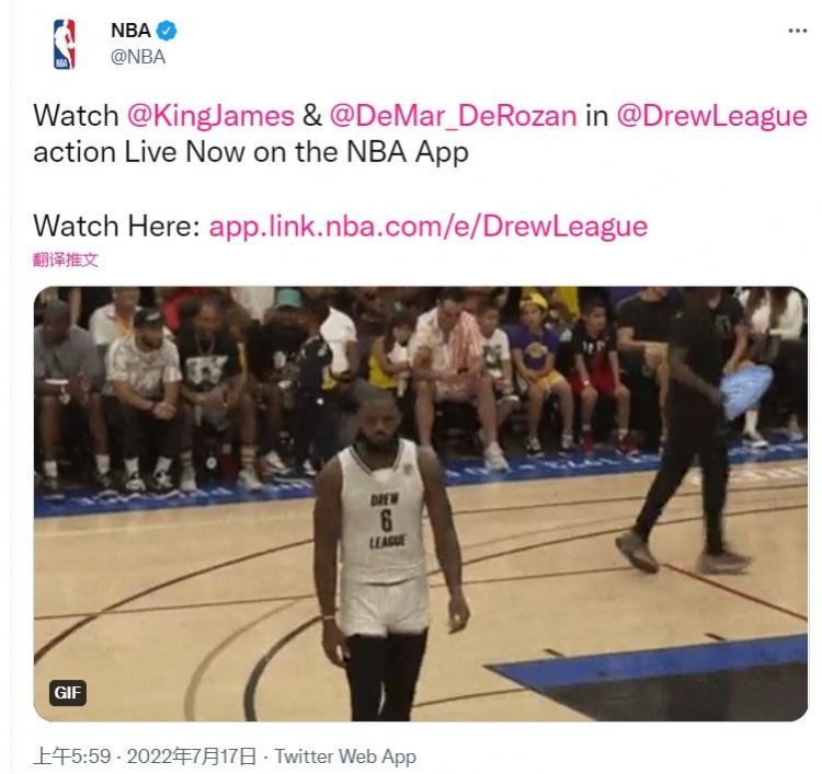 NBA官方推特赛间晒出詹姆斯的比赛照,并告知所有球迷该场比赛正在NBA官方APP实况转播。据多位记者报道,这是德鲁联赛首次被NBA官方转播。