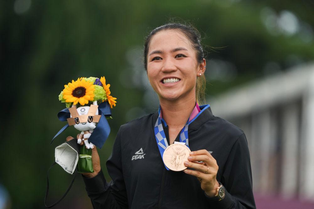 2021年8月7日,季军新西兰选手高宝璟在颁奖仪式上。当日,东京奥运会高尔夫球女子个人比杆赛在日本埼玉县霞关乡村俱乐部完赛,美国选手科达夺得冠军。新华社记者郑焕松 摄