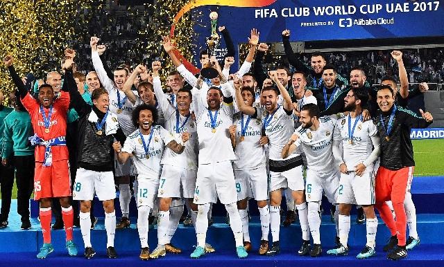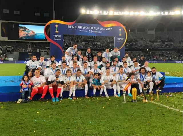 2017年12月16日,皇家马德里队在国际足联俱乐部世界杯颁奖仪式上庆祝夺冠。