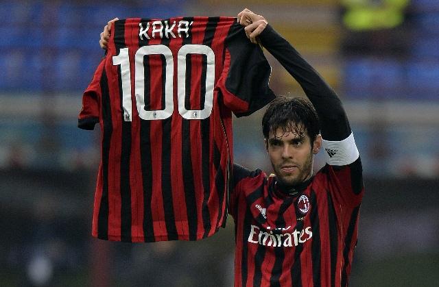2014年1月6日,卡卡在打入其效力AC米兰队的第100个进球后庆祝。