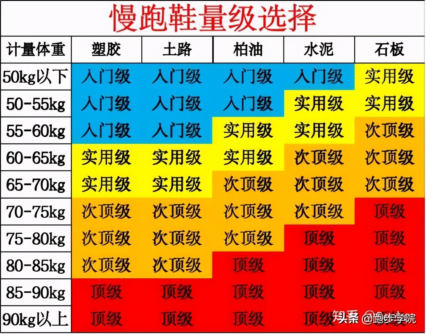 慢跑鞋是根据体重来划分等级,我们暂且按照上表级别来划分等级,这张表格仅供参考。一般相应体重的人可以往上选,比如50kg的跑者选择实用级或次顶级甚至顶级都没问题;但是最好别往下选,比如100kg的跑者,最好就不要去选入门级了,入门级的跑鞋使用的缓震技术相对较少,支撑不了这么大的体重,相对容易受伤。