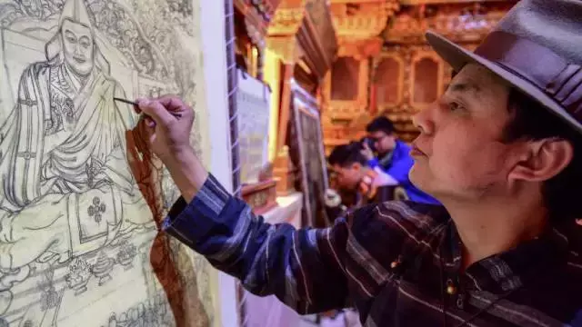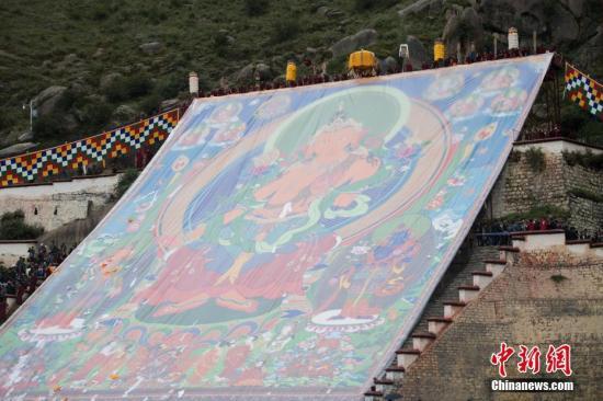 中新社拉萨8月21日电 (孙翔)西藏拉萨哲蚌寺21日首次展出巨型强巴佛唐卡,吸引国内外信众、游客前来瞻仰,标志2017年拉萨雪顿节正式开幕。