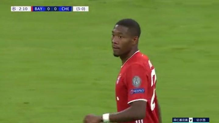 第15分钟,阿拉巴直传,戴维斯左路快速超车对手后横敲,弧顶处穆勒停球在防守干扰下一脚远射,球擦着横梁高出。↓