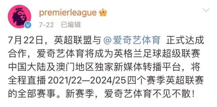 早在7月22日,英超官方微博就已经宣布,未来四个赛季爱奇艺将成为英超的新媒体转播平台,“7月22日,英超联盟与@爱奇艺体育 正式达成合作,爱奇艺体育将成为英格兰足球超级联赛中国大陆及澳门地区独家新媒体转播平台,将全程直播2021/22—2024/25四个赛季英超联赛的全部赛事。”