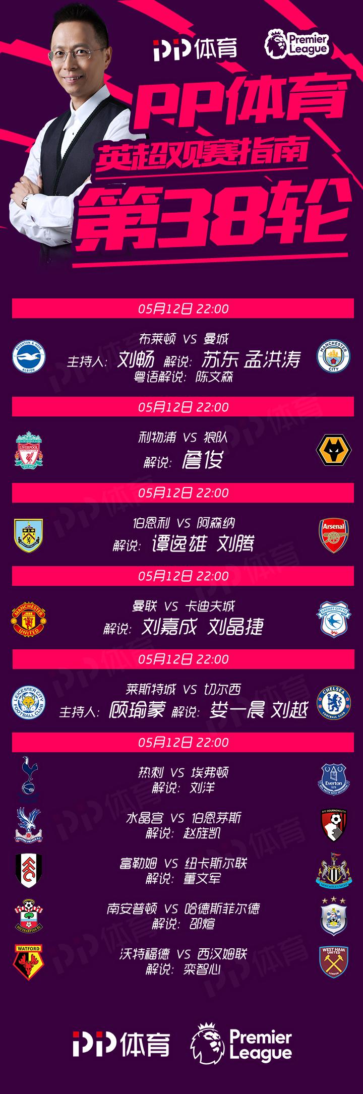 经过整整9个月的激烈角逐,2018-19赛季英超联赛终于要迎来最后的高潮。北京时间5月12日晚22:00,20支球队将一起亮相,PP体育将同时免费视频直播第38轮的全部10场比赛。曼城和利物浦你追我赶,将冠军悬念一直维持到了最后一轮。究竟是蓝月成功卫冕,还是红军首夺英超桂冠?答案即将揭晓。