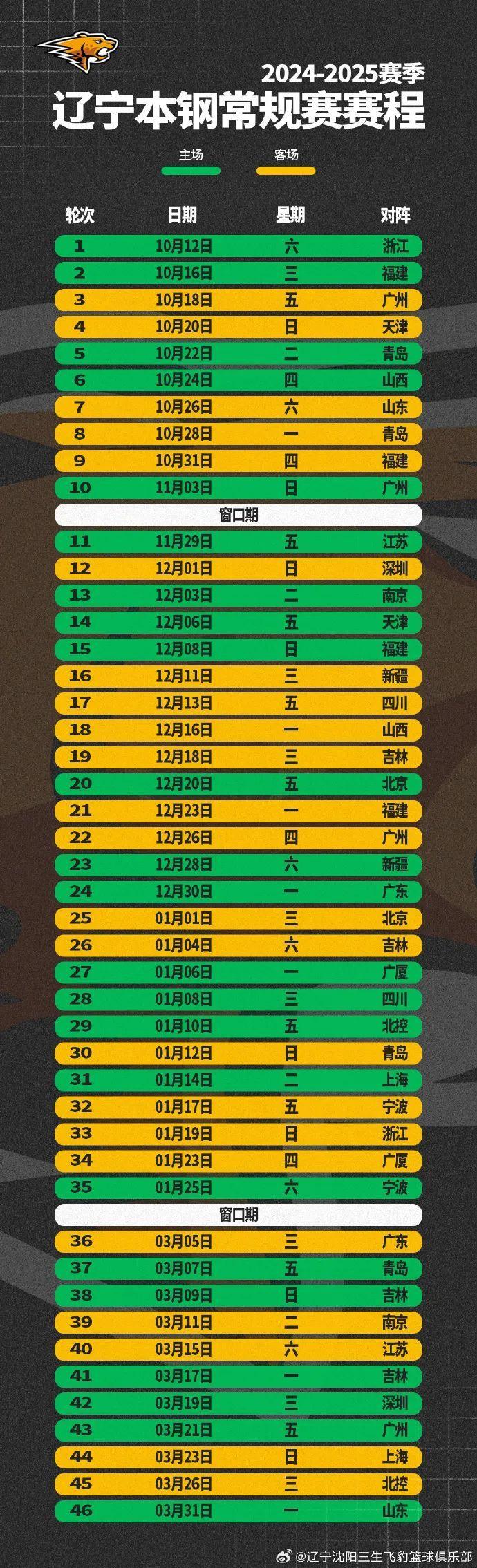 北京时间9月16日,CBA联赛官方公布《2024-2025赛季CBA联赛常规赛对阵表》,新赛季CBA联赛将于2024年10月12日开赛,常规赛共46轮。