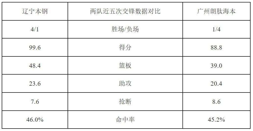 本赛季两队交手1次,辽宁本钢客场120-88战胜广州朗肽海本。