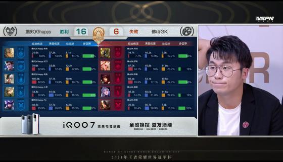 2021年王者荣耀世界冠军杯总决赛由佛山GK对阵重庆QGhappy,两支队伍均为第一次进入世冠总决赛。最终,重庆QGhappy四比二战胜佛山GK,重庆QGhappy实现大满贯。