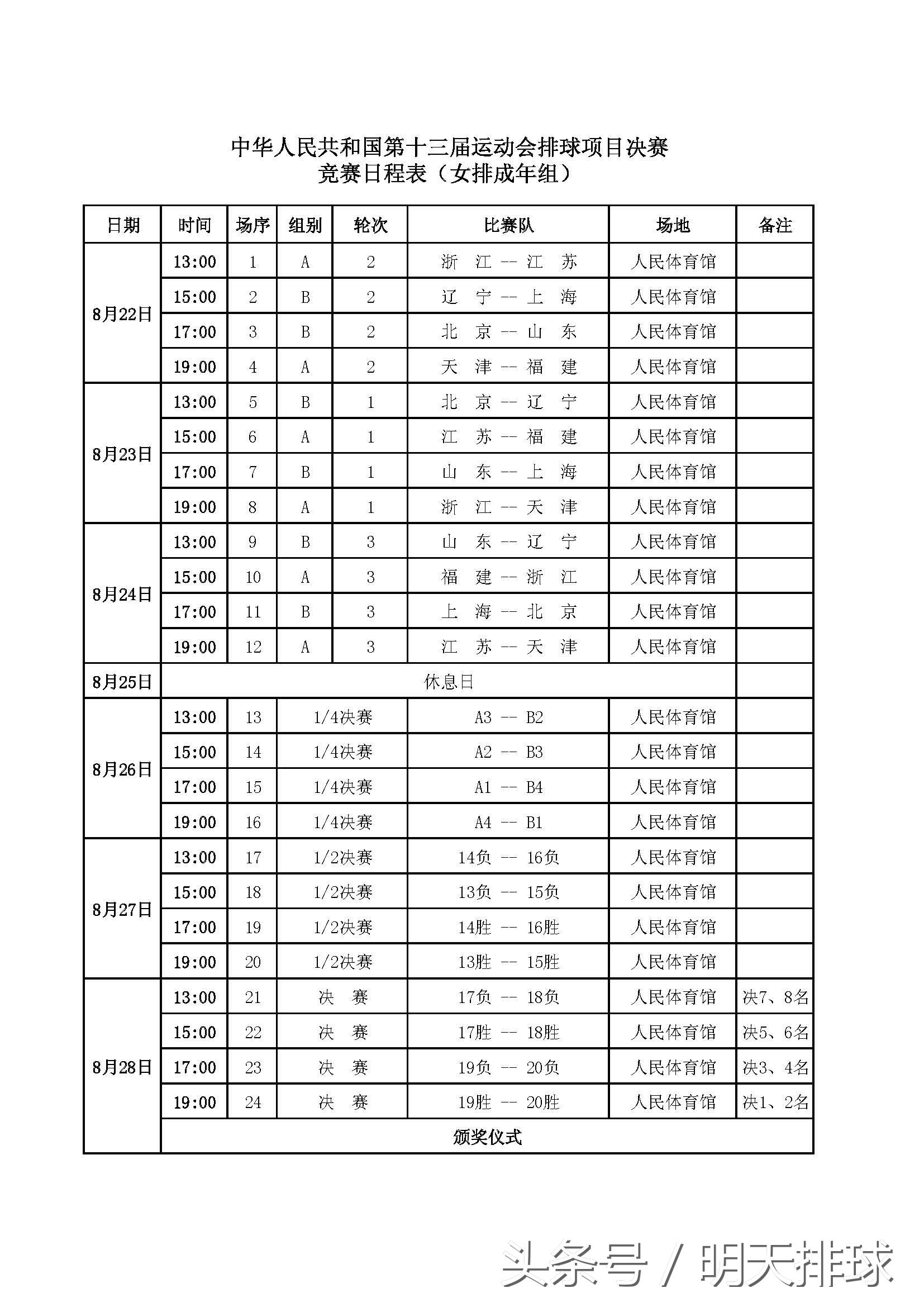 第13届全运会将于8月27日至9月8日在天津举行,排球比赛是本届全运会最受关注的比赛项目之一。其中女排比赛将先于开幕式日开始举行,下周二,也就是8月22日,两个小组、8支球队的全运会女排比赛就将在天津人民体育馆开赛。