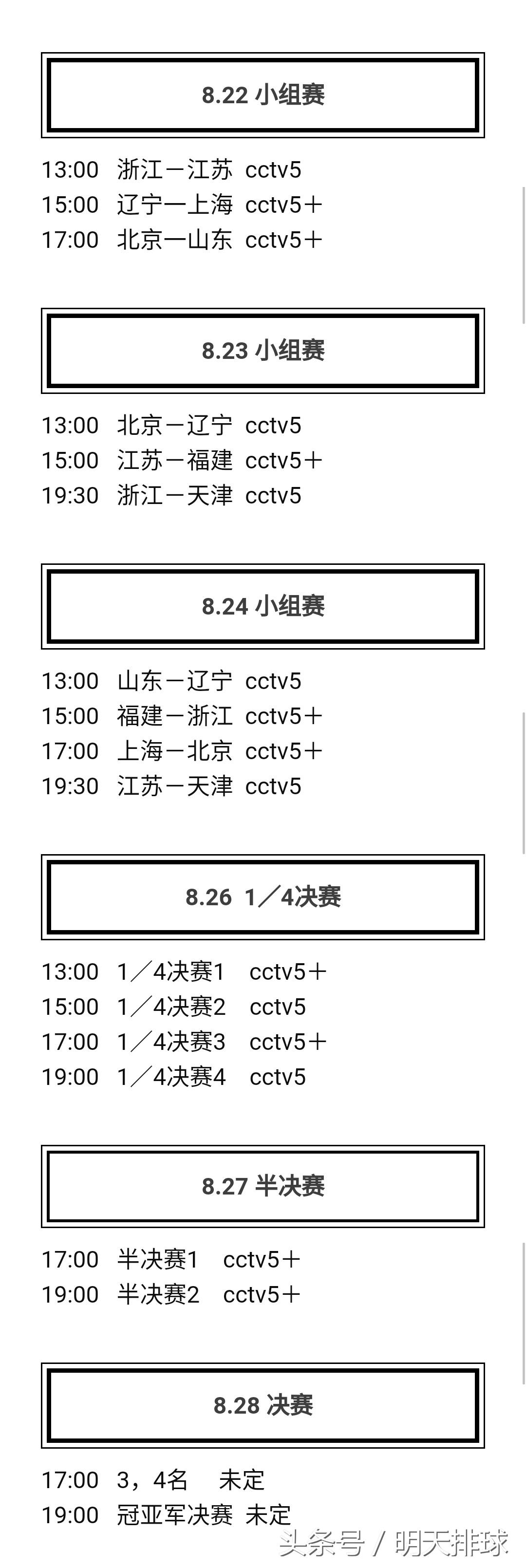 从目前公布的央视全运会直播计划来看,体育频道(CCTV5)和体育赛事频道(CCTV5+)将直播除了第一、第二天各有一场小组赛以外的所有比赛。具体计划见上图,播出以央视实际的安排为准。