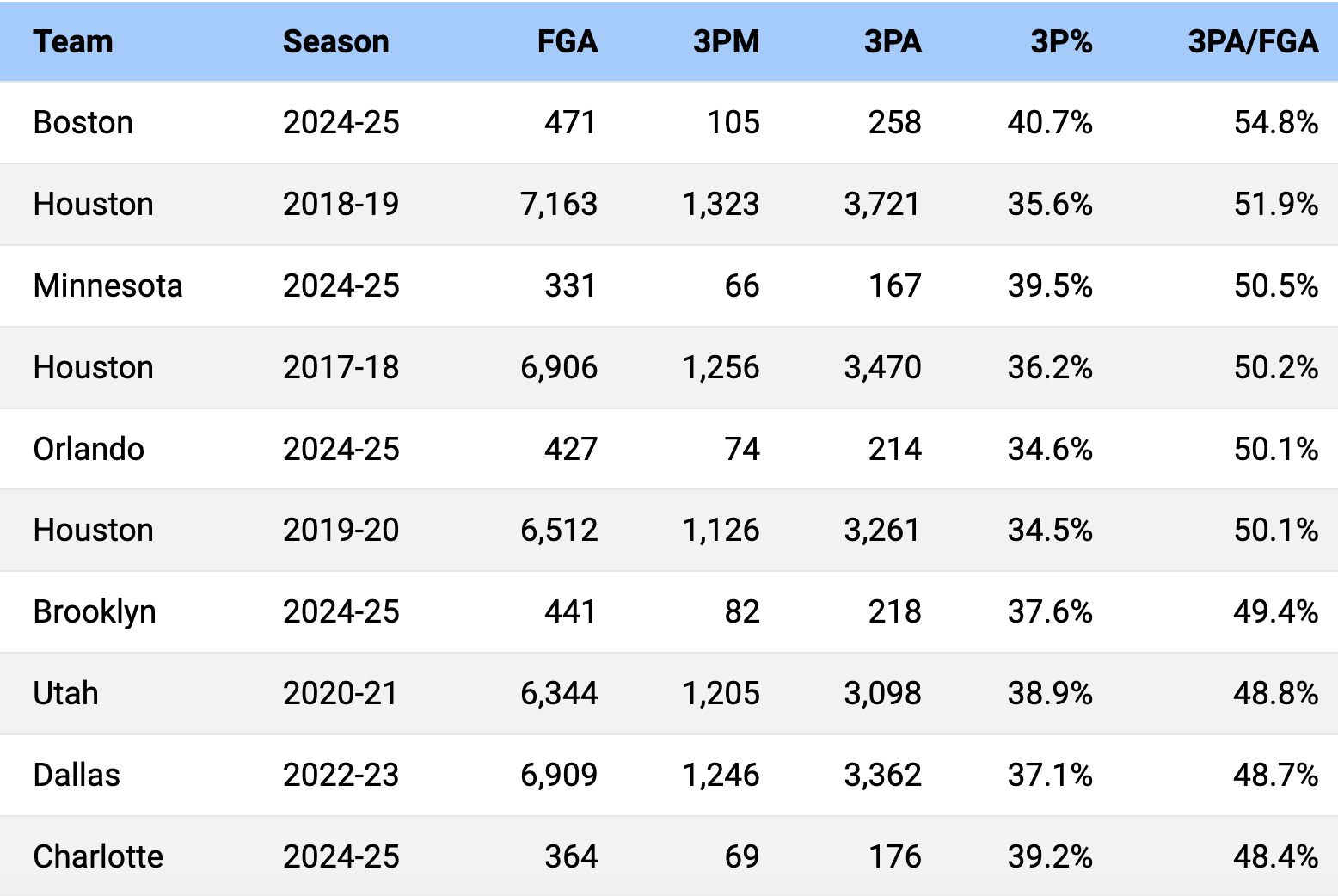 在过去的45个赛季中,只有三支球队——2017-18、2018-19和2019-20赛季的休斯顿火箭——至少有一半的出手来自三分线外。而截至周四,本赛季已有三支球队达成此数据。