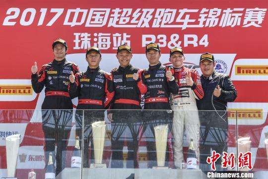 7月9日,在2017中国超级跑车锦标赛GT3组别的比赛中,香港车手卢彪(左三)/毛俊豪(左四)、李英健(左二)/区柏祥(左一)分别夺得冠亚军。 陈骥旻 摄