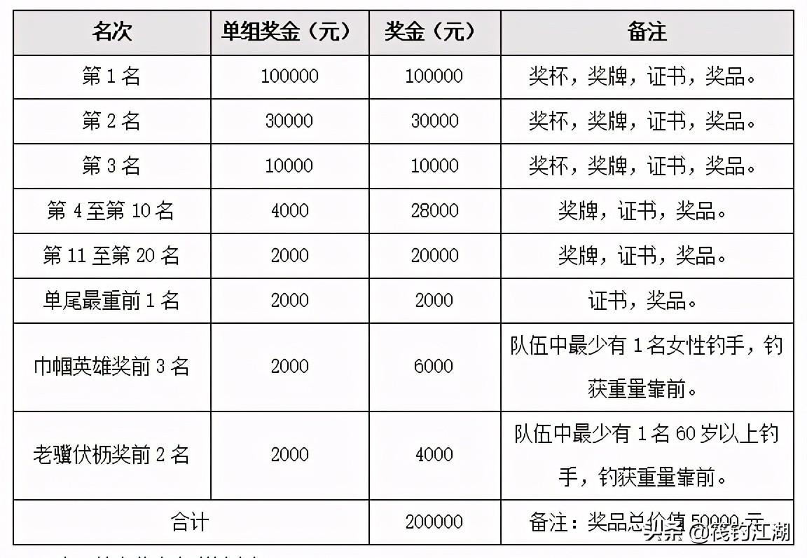 总奖金20万元,奖励总成绩前二十名参赛队和最重单尾的参赛队;同时另设巾帼英雄奖3名和老骥伏枥奖2名。获得奖金的参赛选手本人须依法纳税。