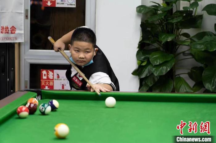天津首届少儿台球争霸赛现场,选手们聚精会神参与比赛。 张津榕 摄