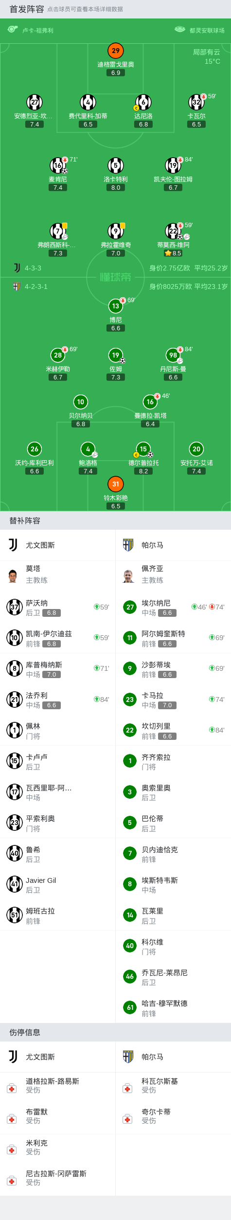 北京时间10月31日3:45,意甲第10轮,尤文图斯主场对阵帕尔马,赛前双方首发公布。上半场,德尔普拉托头球破门,麦肯尼头球扳平,弗拉霍维奇补射打高,佐姆推射建功。下半场,蒂莫西-维阿抢点破门,弗拉霍维奇小角度打门高出球门,最终,尤文2-2战平帕尔马。