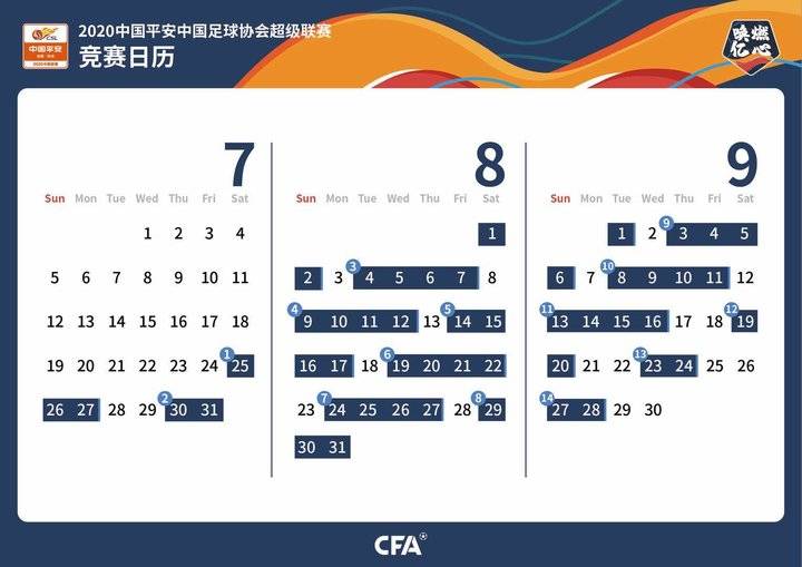 2020赛季中超联赛第一阶段的竞赛日历已经出炉,本赛季联赛第一阶段将从7月25日持续到9月28日,期间每轮比赛都至少有1个休赛日,两个赛区前期在4天内踢完一轮比赛,到9月19日起至第一阶段结束则是两天一轮。